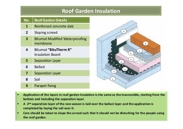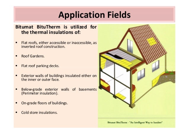 - 7. Application Fields Bitumat BituTherm is utilized for the thermal insulations of: Flat roofs, either accessible or inaccessible, as inverted roof construction. Roof Gardens. Flat roof parking decks.Flat roof parking decks. Exterior walls of buildings insulated either on the inner or outer face. Below-grade exterior walls of basements (Perimeter insulation). On-grade floors of buildings. Cold store insulations.