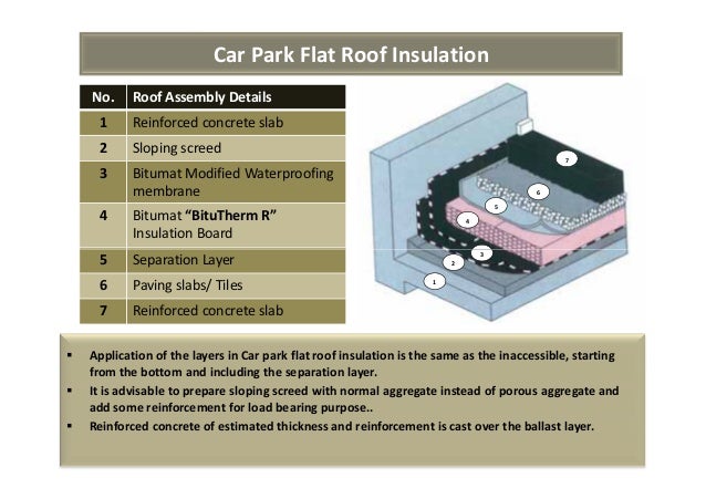 - 12. Car Park Flat Roof Insulation No. Roof Assembly Details 1 Reinforced concrete slab 2 Sloping screed 3 Bitumat Modified Waterproofing membrane 4 Bitumat “BituTherm R” Insulation Board 6 5 4 7 5 Separation Layer 6 Paving slabs/ Tiles 7 Reinforced concrete slab 1 3 2 Application of the layers in Car park flat roof insulation is the same as the inaccessible, starting from the bottom and including the separation layer. It is advisable to prepare sloping screed with normal aggregate instead of porous aggregate and add some reinforcement for load bearing purpose.. Reinforced concrete of estimated thickness and reinforcement is cast over the ballast layer.