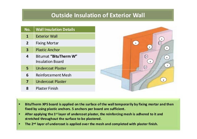 - 14. Outside Insulation of Exterior Wall No. Wall Insulation Details 1 Exterior Wall 2 Fixing Mortar 3 Plastic Anchor 4 Bitumat “BituTherm W” Insulation Board 5 Undercoat Plaster 1 6 5 4 3 2 7 5 Undercoat Plaster 6 Reinforcement Mesh 7 Undercoat Plaster 8 Plaster Finish BituTherm XPS board is applied on the surface of the wall temporarily by fixing mortar and then fixed by using plastic anchors. 5 anchors per board are sufficient. After applying the 1st layer of undercoat plaster, the reinforcing mesh is adhered to it and stretched throughout the surface to be plastered. The 2nd layer of undercoat is applied over the mesh and completed with plaster finish. 8