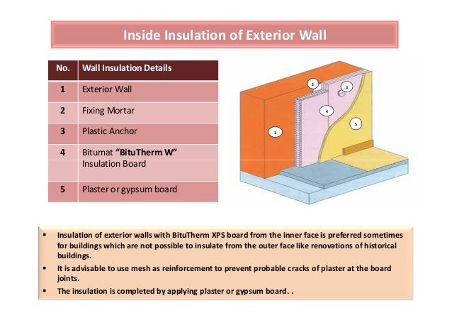- 15. Inside Insulation of Exterior Wall No. Wall Insulation Details 1 Exterior Wall 2 Fixing Mortar 3 Plastic Anchor 4 Bitumat “BituTherm W” Insulation Board 1 5 4 3 2 Insulation Board 5 Plaster or gypsum board Insulation of exterior walls with BituTherm XPS board from the inner face is preferred sometimes for buildings which are not possible to insulate from the outer face like renovations of historical buildings. It is advisable to use mesh as reinforcement to prevent probable cracks of plaster at the board joints. The insulation is completed by applying plaster or gypsum board. .