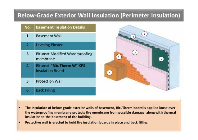 - 16. Below-Grade Exterior Wall Insulation (Perimeter Insulation) No. Basement Insulation Details 1 Basement Wall 2 Leveling Plaster 3 Bitumat Modified Waterproofing membrane 4 Bitumat “BituTherm W” XPS Insulation Board 1 5 4 3 2 Insulation Board 5 Protection Wall 6 Back Filling The Insulation of below-grade exterior walls of basement, BituTherm board is applied loose over the waterproofing membrane protects the membrane from possible damage along with thermal insulation to the basement of the building. Protective wall is erected to hold the insulation boards in place and back filling. 6