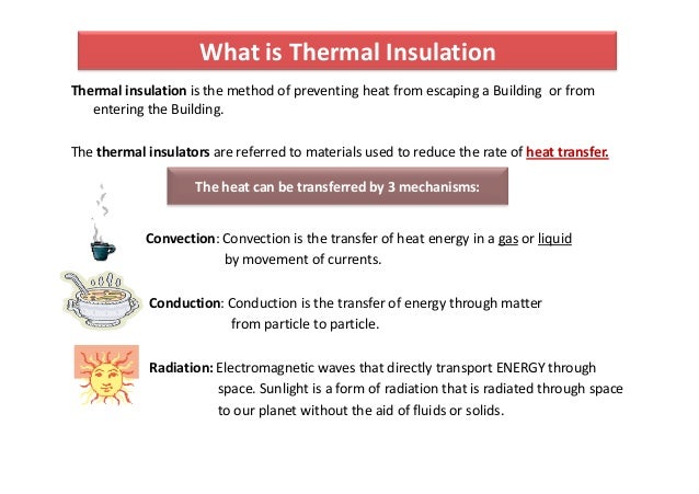 - 2. What is Thermal Insulation Thermal insulation is the method of preventing heat from escaping a Building or from entering the Building. The thermal insulators are referred to materials used to reduce the rate of heat transfer. Convection: Convection is the transfer of heat energy in a gas or liquid The heat can be transferred by 3 mechanisms: by movement of currents. Conduction: Conduction is the transfer of energy through matter from particle to particle. Radiation: Electromagnetic waves that directly transport ENERGY through space. Sunlight is a form of radiation that is radiated through space to our planet without the aid of fluids or solids.