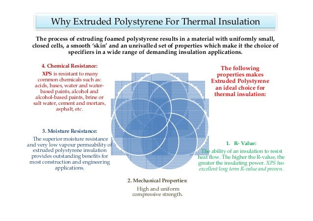 - 4. Why Extruded Polystyrene For Thermal Insulation The process of extruding foamed polystyrene results in a material with uniformly small, closed cells, a smooth ‘skin’ and an unrivalled set of properties which make it the choice of specifiers in a wide range of demanding insulation applications. The following properties makes Extruded Polystyrene an ideal choice for thermal insulation: 4. Chemical Resistance: XPS is resistant to many common chemicals such as: acids, bases, water and water- based paints, alcohol and alcohol-based paints, brine or salt water, cement and mortars, asphalt, etc. 1. R- Value: The ability of an insulation to resist heat flow. The higher the R-value, the greater the insulating power. XPS has excellent long term R-value and proven. 2. Mechanical Properties: High and uniform compressive strength. 3. Moisture Resistance: The superior moisture resistance and very low vapour permeability of extruded polystyrene insulation provides outstanding benefits for most construction and engineering applications. asphalt, etc.