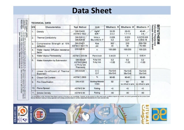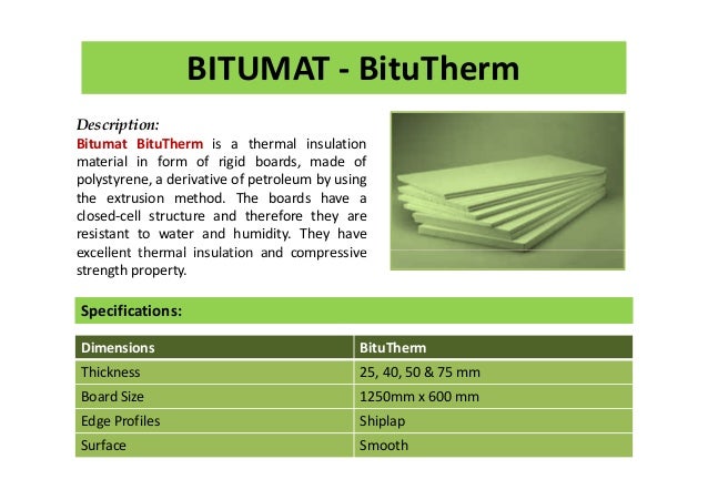 - 5. BITUMAT - BituTherm Description: Bitumat BituTherm is a thermal insulation material in form of rigid boards, made of polystyrene, a derivative of petroleum by using the extrusion method. The boards have a closed-cell structure and therefore they are resistant to water and humidity. They have excellent thermal insulation and compressiveexcellent thermal insulation and compressive strength property. Specifications: Dimensions BituTherm Thickness 25, 40, 50 & 75 mm Board Size 1250mm x 600 mm Edge Profiles Shiplap Surface Smooth
