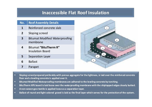 - 9. Inaccessible Flat Roof Insulation No. Roof Assembly Details 1 Reinforced concrete slab 2 Sloping screed 3 Bitumat Modified Waterproofing membrane 4 Bitumat “BituTherm R” Insulation Board 6 5 4 7 5 Separation Layer 6 Ballast 7 Parapet 1 3 2 Sloping screed prepared preferably with porous aggregate for the lightness, is laid over the reinforced concrete floor and a leveling concrete is applied over it. Bitumat Modified Waterproofing membranes are adhered to the leveling concrete by torching. BituTherm XPS board is laid loose over the waterproofing membrane with the shiplapped edges closely butted. A non-woven geo-textile is applied loose as a separation layer. Ballast of round and light colored gravel is laid as the final layer which serves for the protection of the system.
